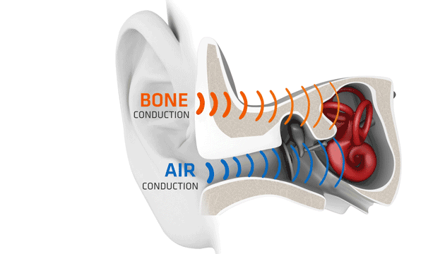 Transducers send vibrations through the cheekbones and deliver sound directly to the inner ear, bypassing the eardrum.