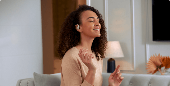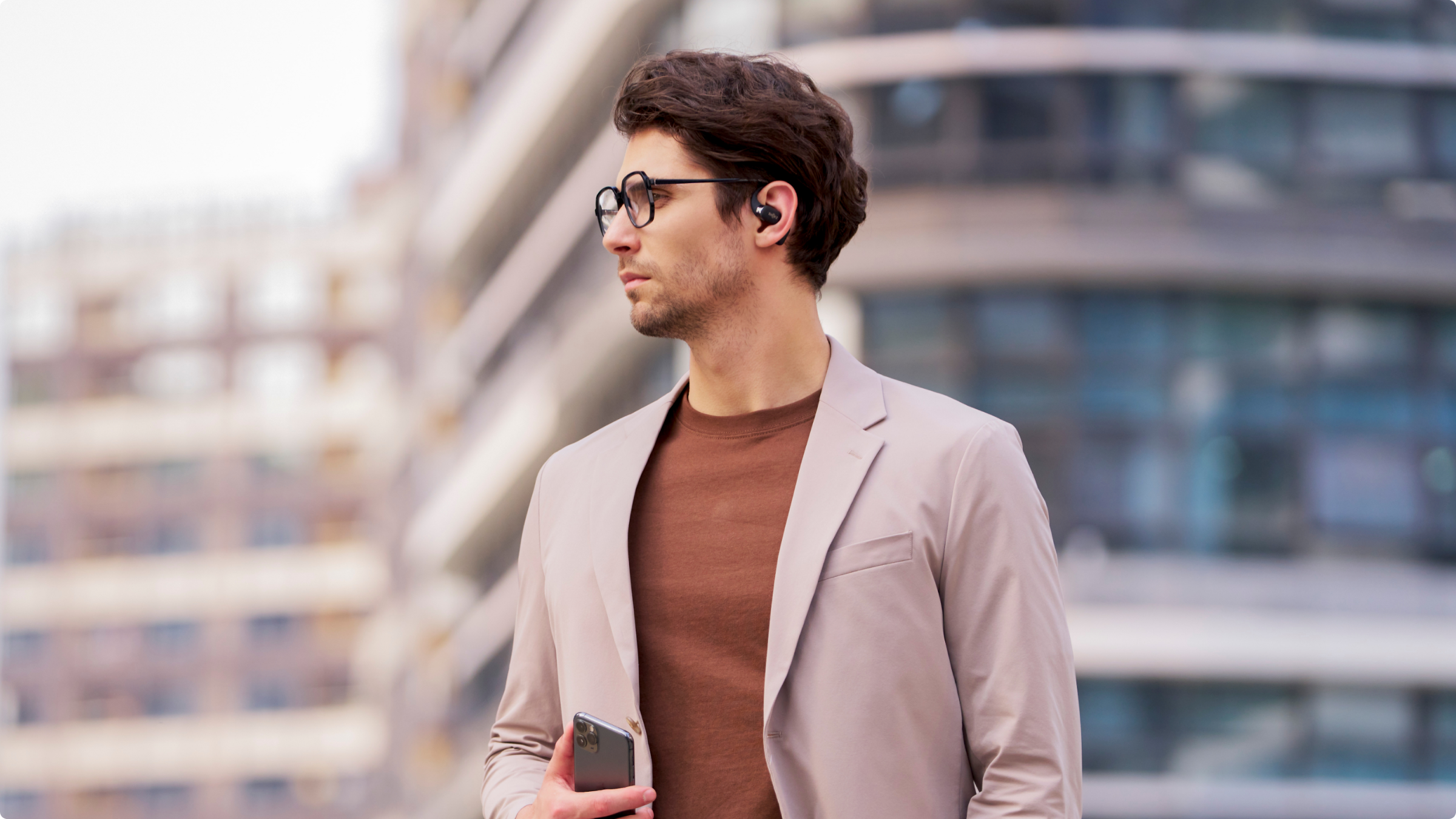 Optimizing the design and material of open-ear earbuds, OpenFit is compact and light, weighing just 8.3 grams.4 The earbuds and battery compartment provide a perfect balance that makes you forget you’re even wearing them.